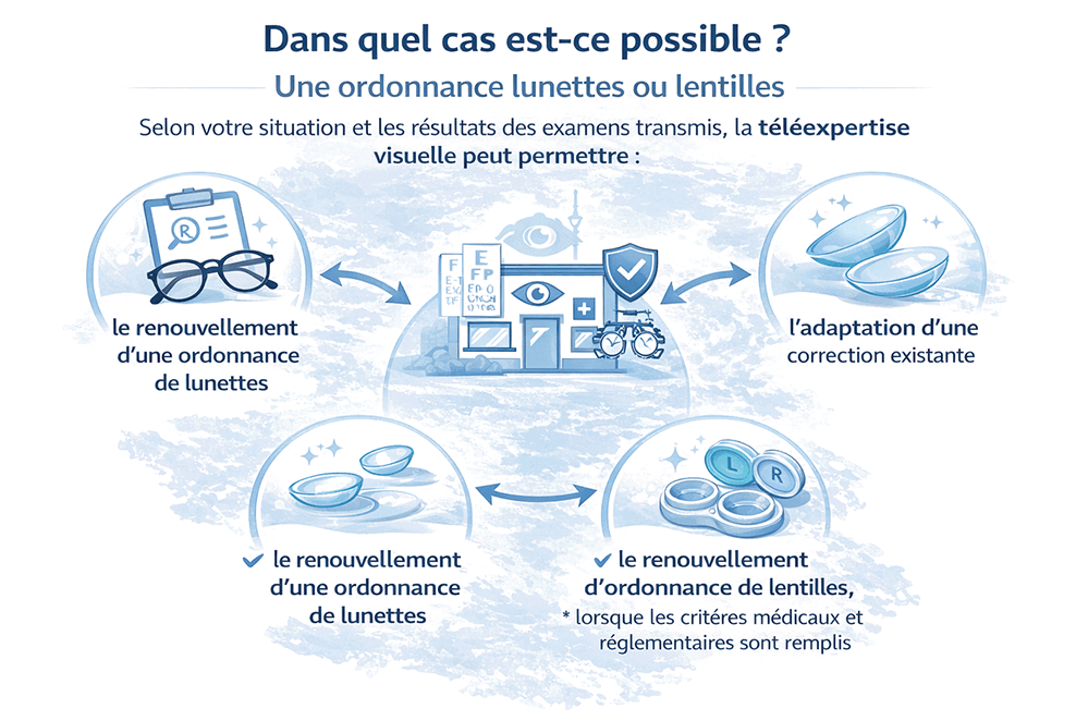 - le renouvellement d’ordonnance de lentilles, lorsque les critères médicaux et réglementaires sont remplis.